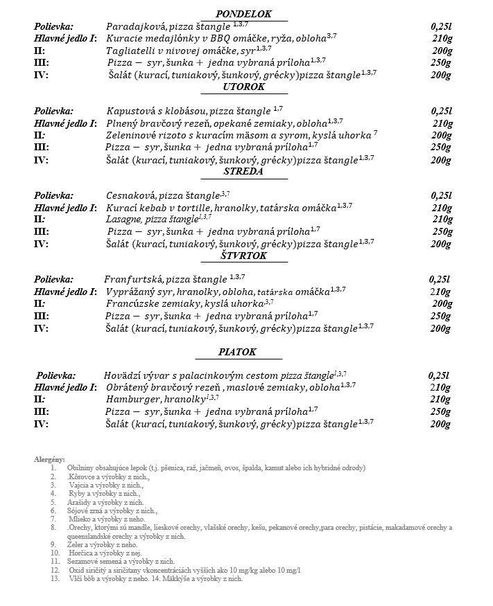 Menu Denné menu 10.11.2024 – 14.11.2025, podávame do 13:30,Menu 1, 2, 4 cena: 6,00€ Menu 3- 6,50€ Objednávky na t.č. 045/6855888