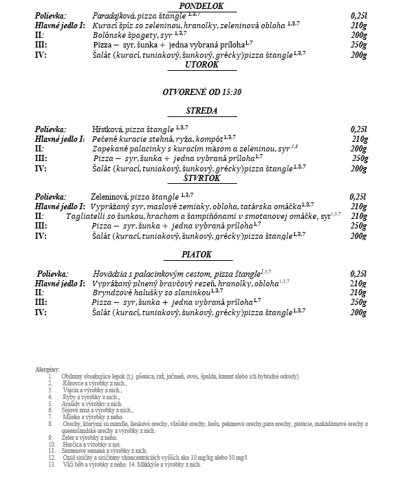 Menu Denné menu 05.01.2024 – 09.01.2025, podávame do 13:30,Menu 1, 2, 4 cena: 6,50€ Menu 3- 7,00€Objednávky na t.č. 045/6855888